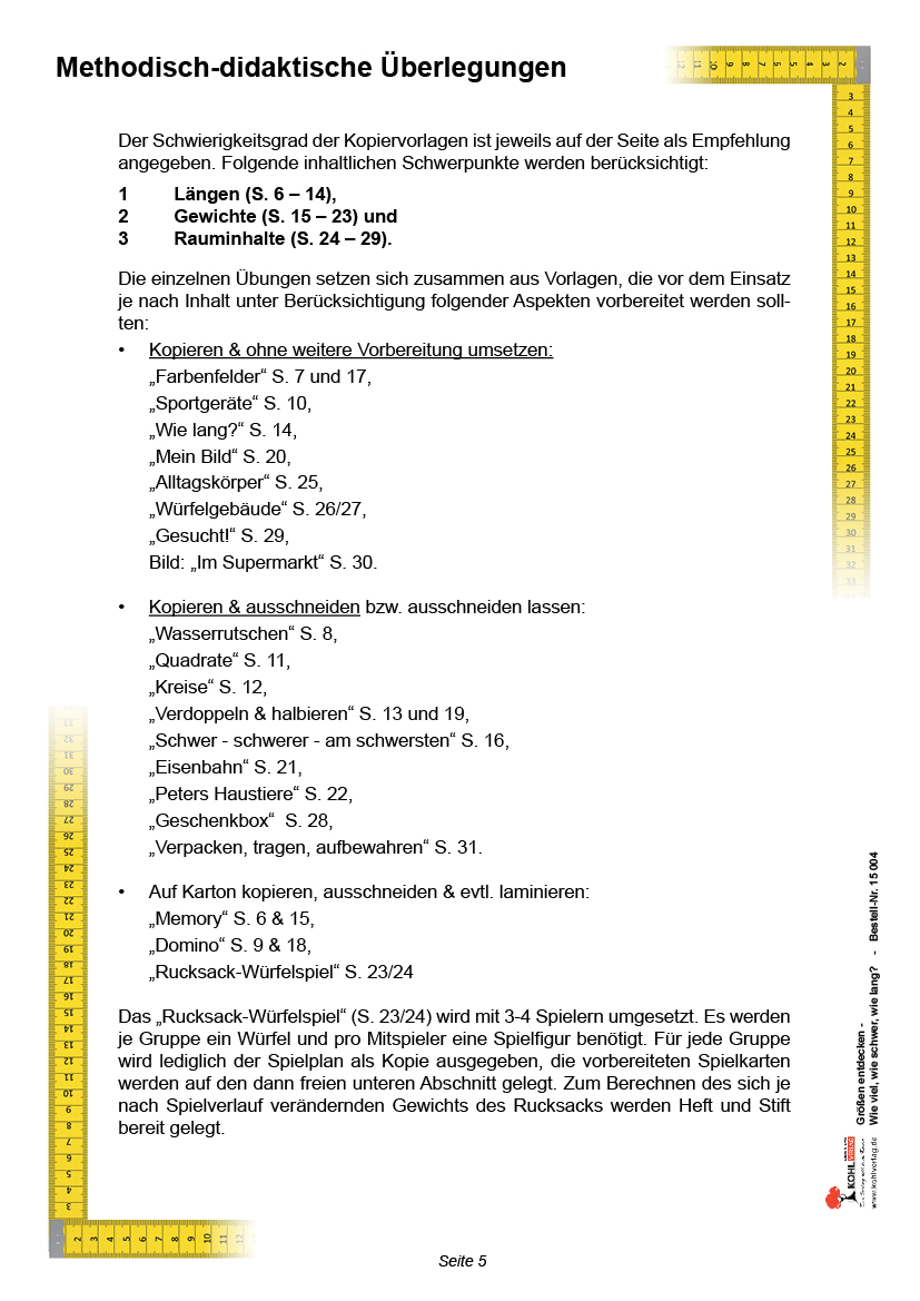 Puzzle, Domino, Memory, Zuordnungen von Bild und Bild/ Bild und Text/ Text und Text sind nur einige der Materialien, mit denen die Größenbereiche "Längen, Gewichte und Rauminhalte" erfahrbar gemacht werden können.