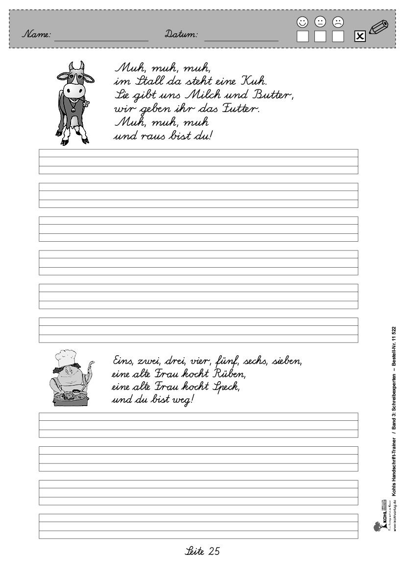 Dieser Band ist in Grundschrift gehalten. Er ist ebenfalls erhältlich in den Schriftarten Lateinische Ausgangsschrift (LA), Vereinfachte Ausgangsschrift (VA) und Schulausgangsschrift (SaS). Bitte wenden Sie sich an info@kohlverlag.de.