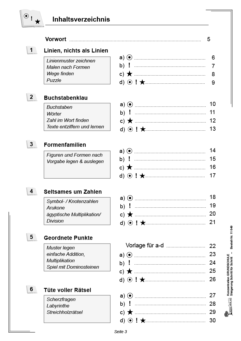 Das Arbeitsheft ist vorgesehen zum Einsatz in der Grundschule in den Klassen 1 bis 4. Die Arbeitsblätter enthalten motivierende Übungen und Aufgaben zur Stärkung der Konzentrationsfähigkeit. Die Arbeitsaufträge sind differenziert in drei verschiedenen Schwierigkeitsstufen. Die Kopiervorlagen sind bestens geeignet zum selbstständigen Arbeiten, für Vertretungsstunden, als Zusatzaufgaben für zwischendurch oder als regelmäßige Übungseinheit für zu Hause. Der Band ist mit Lösungen - auch zur Selbstkontrolle - ausgestattet.