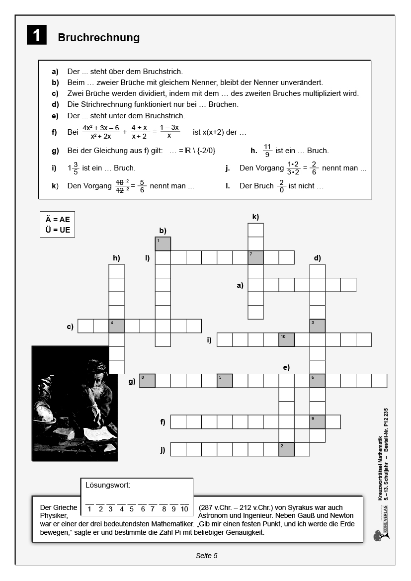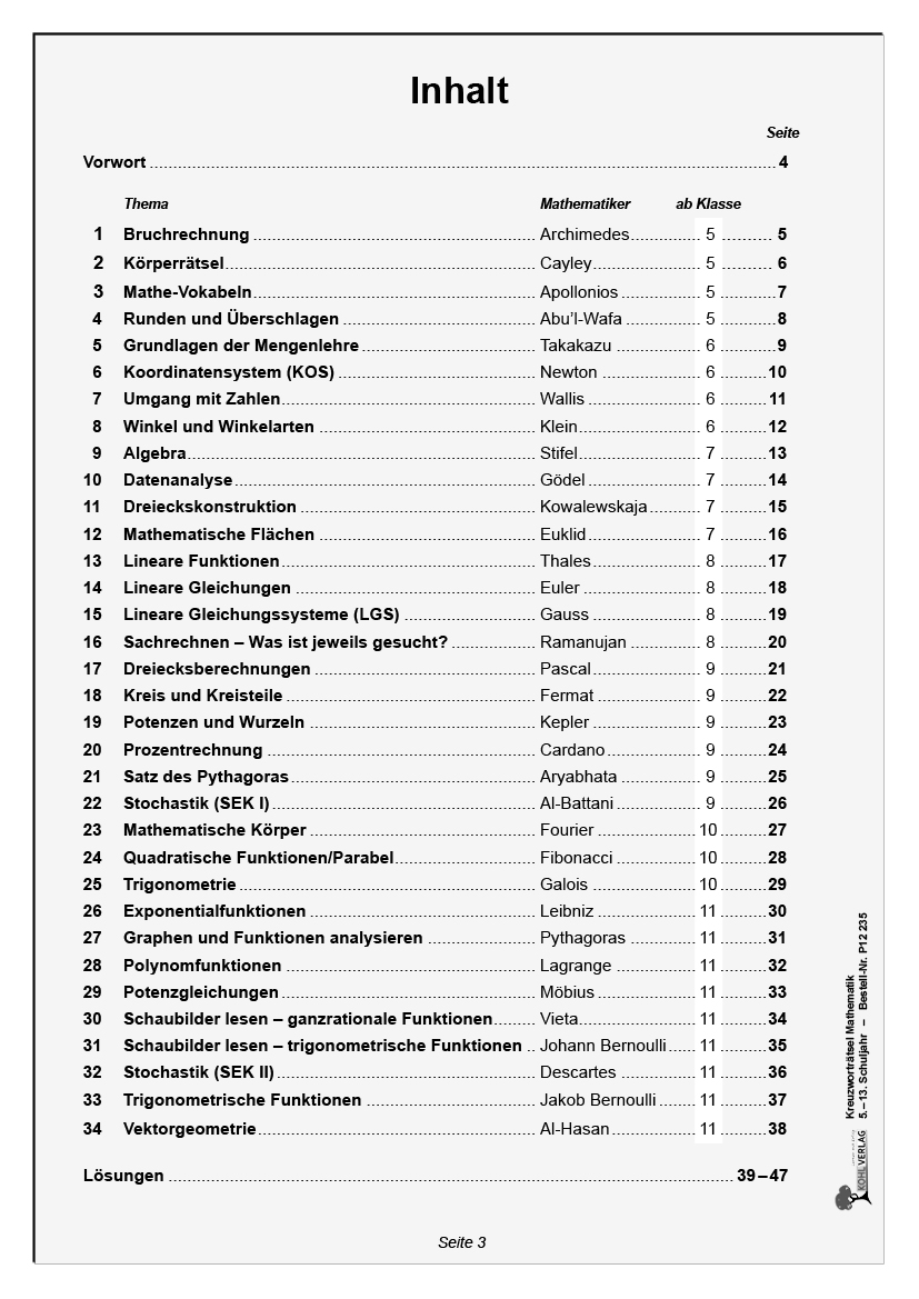 Zur Stärkung der Allgemeinbildung und als zusätzlicher Anreiz das Rätsel auch zu lösen, bildet bei jedem Rätsel der Name eines berühmten Mathematikers das Lösungswort. In einem kleinen Wissensspeicher sind Lebensdaten und Errungenschaften dieser Vordenker zusammengefasst. Somit erfahren die Schülerinnen und Schüler auch, dass Mathematik eine universelle Sprache ist, die weltweit bereits seit vielen Jahrhunderten gesprochen wird. Zur leichteren Orientierung habe ich die jeweils gesuchten Mathematiker auch im Inhaltsverzeichnis aufgeführt.