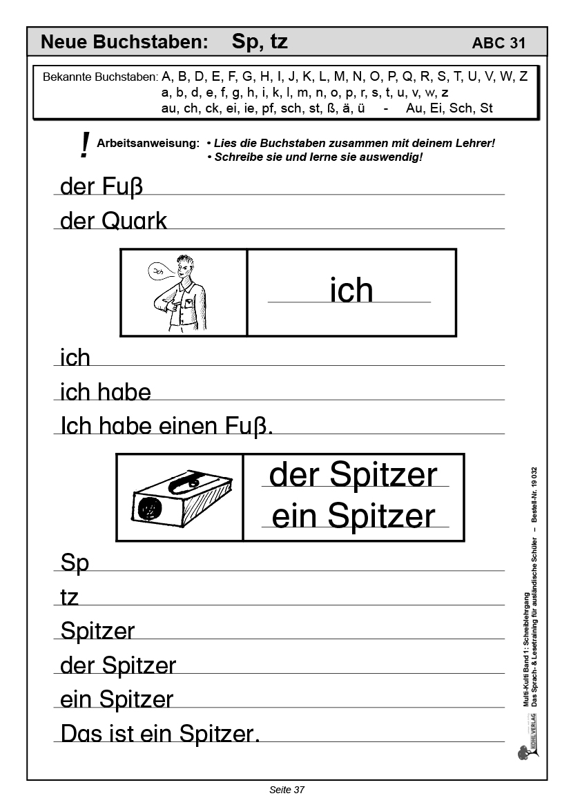 Diese Kopiervorlagen wurden speziell für Schüler entwickelt, die nur rudimentäre Deutschkenntnisse vorweisen. Das Heft Schreiblehrgang bildet den Einstieg in die deutsche Sprache. Es werden nach und nach die einzelnen Buchstaben des Alphabets vorgestellt und mit ersten einfachen Begriffen eingeübt. Die Schreibaufgaben sind in der Schulausgangsschrift gehalten.