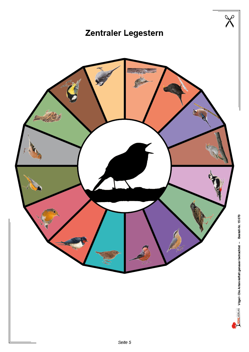 Amsel, Drossel, Meise oder doch Spatz? Früher konnten das die Menschen leicht unterscheiden – heute oft nicht mehr, obwohl viele Vögel „Kulturfolger“ sind und mittlerweile auch in unseren Städten leben, wo sie leicht Nahrung finden. Damit dieses Wissen nicht in Vergessenheit gerät, sollen die Schüler hier einiges über das Aussehen und die Stimmen der Vögel erfahren. In diesem umfangreichen Band wird auf liebevoll farblich gestalteten Karten zum Anlegen eine Reihe der häufig bei uns vorkommenden Vögel vorgestellt. Ein ansprechender Legestern mit 16 Strahlen!